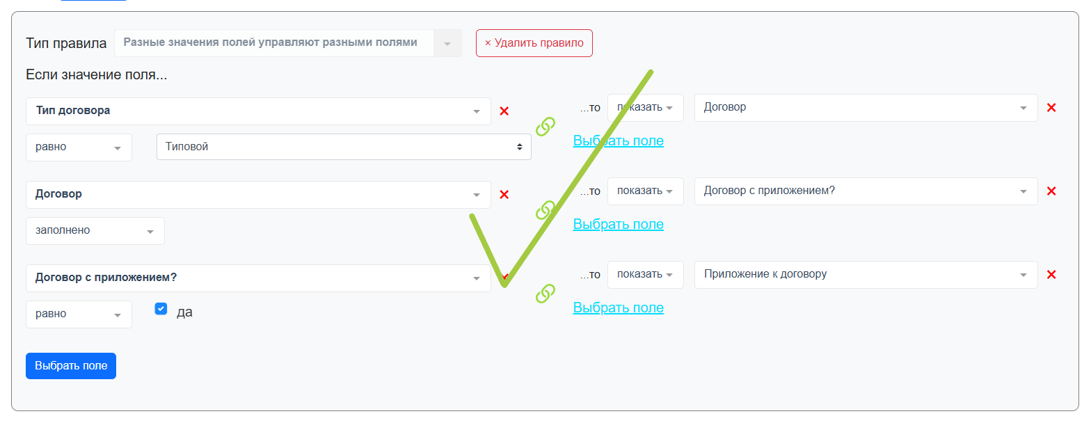 6. После выбора правила переходим непосредственно к настройке зависимостей. Поля, выбранные на этапе добавления полей (пункт 3), но не используемые в правилах, будут отображаться всегда.