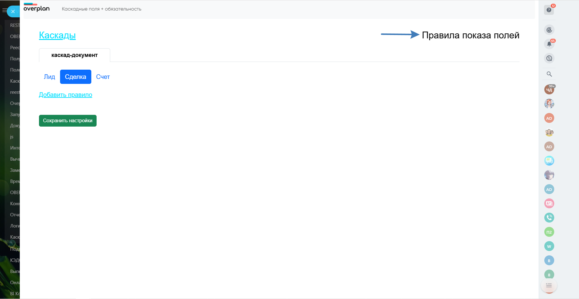 3.Следующим действием добавляем те поля, которые будем использовать в каскаде, и нажимаем “Сохранить настройки”. Поля, которые будут выбраны на этом этапе, но не используемые в правилах, будут отображаться всегда.