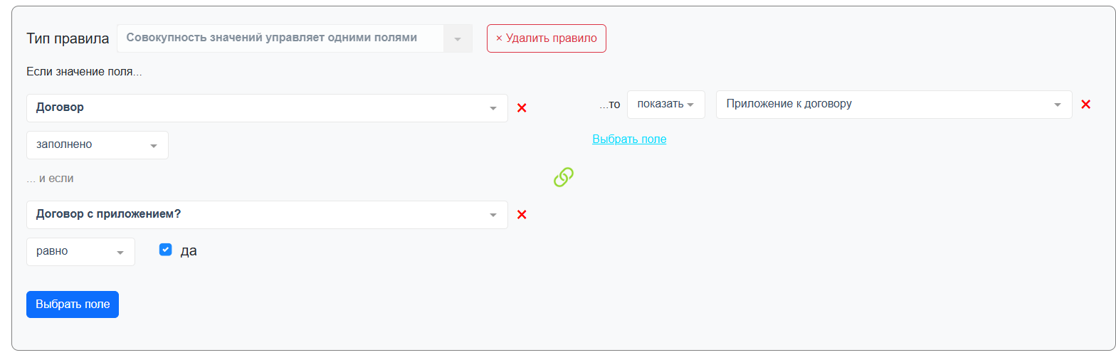 c. совокупность значений управляет одним полем - данное правило подойдет, когда нужно настроить отображение одинакового набора полей в зависимости от значений других полей, по принципу И между условиями.