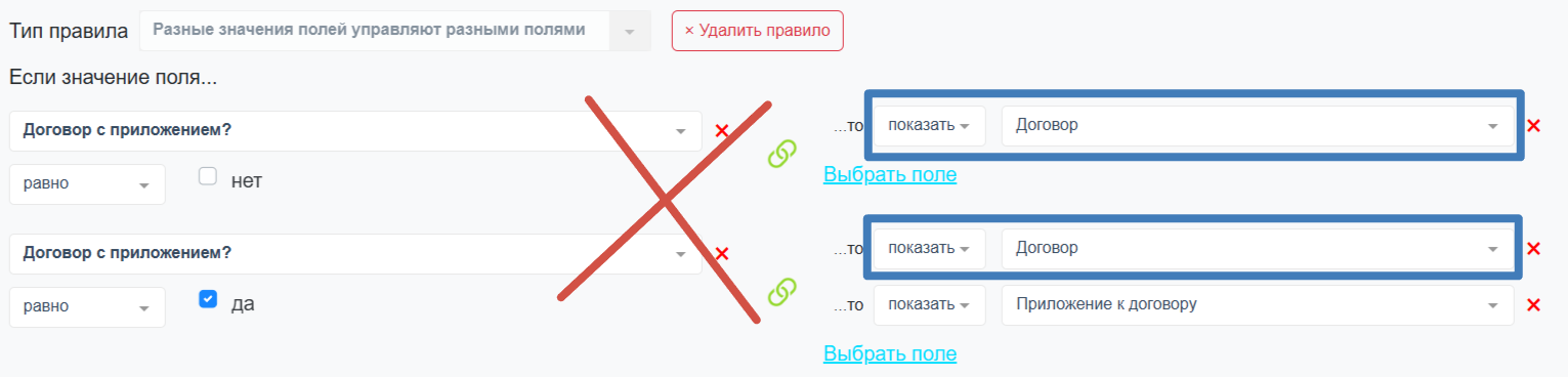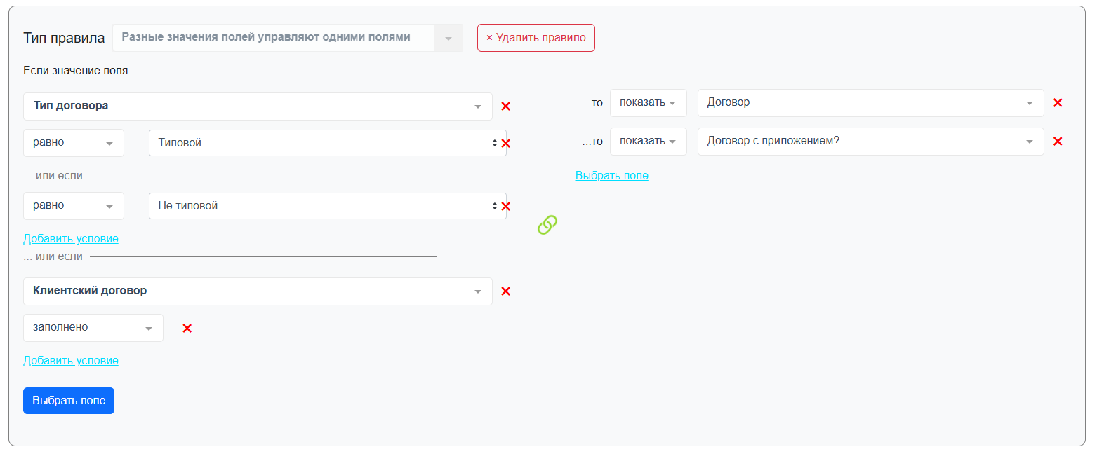 b. разные значения полей управляют одними полями - данное правило подойдет, когда нужно настроить отображение одинакового набора полей в зависимости от значений других полей, по принципу ИЛИ между условиями.
