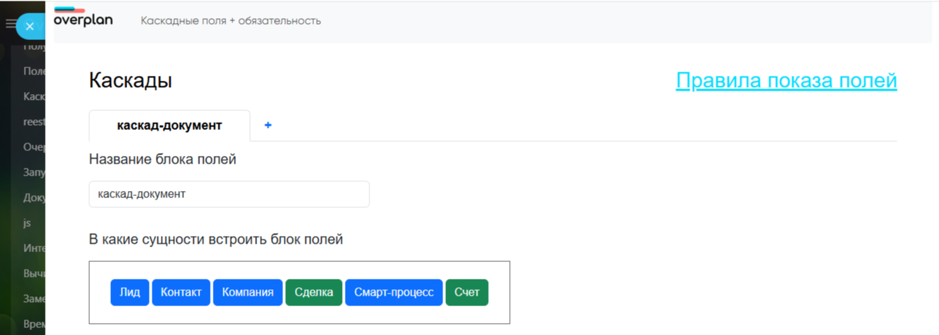 4. После выбора полей переходим непосредственно к настройке каскада. Переходим на экран “Правила показа полей”, выбираем сущность, для которой будем создавать каскад, и нажимаем “Добавить правило”.