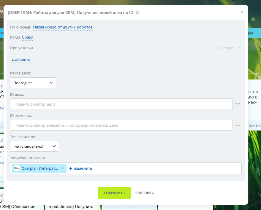 7. И заключительный робот - “Получение полей дела по ID”. Настраивается абсолютно аналогично предыдущему.