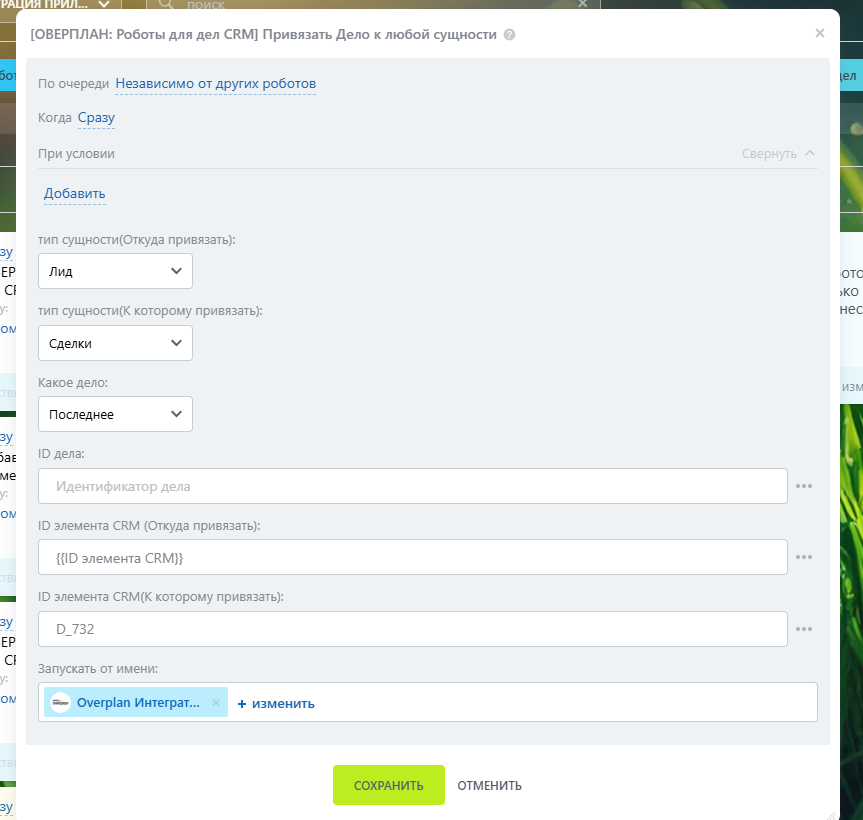- “Тип сущности” и “ID элемента CRM”- выбираем типы сущностей и указываем их ID для привязки дела.