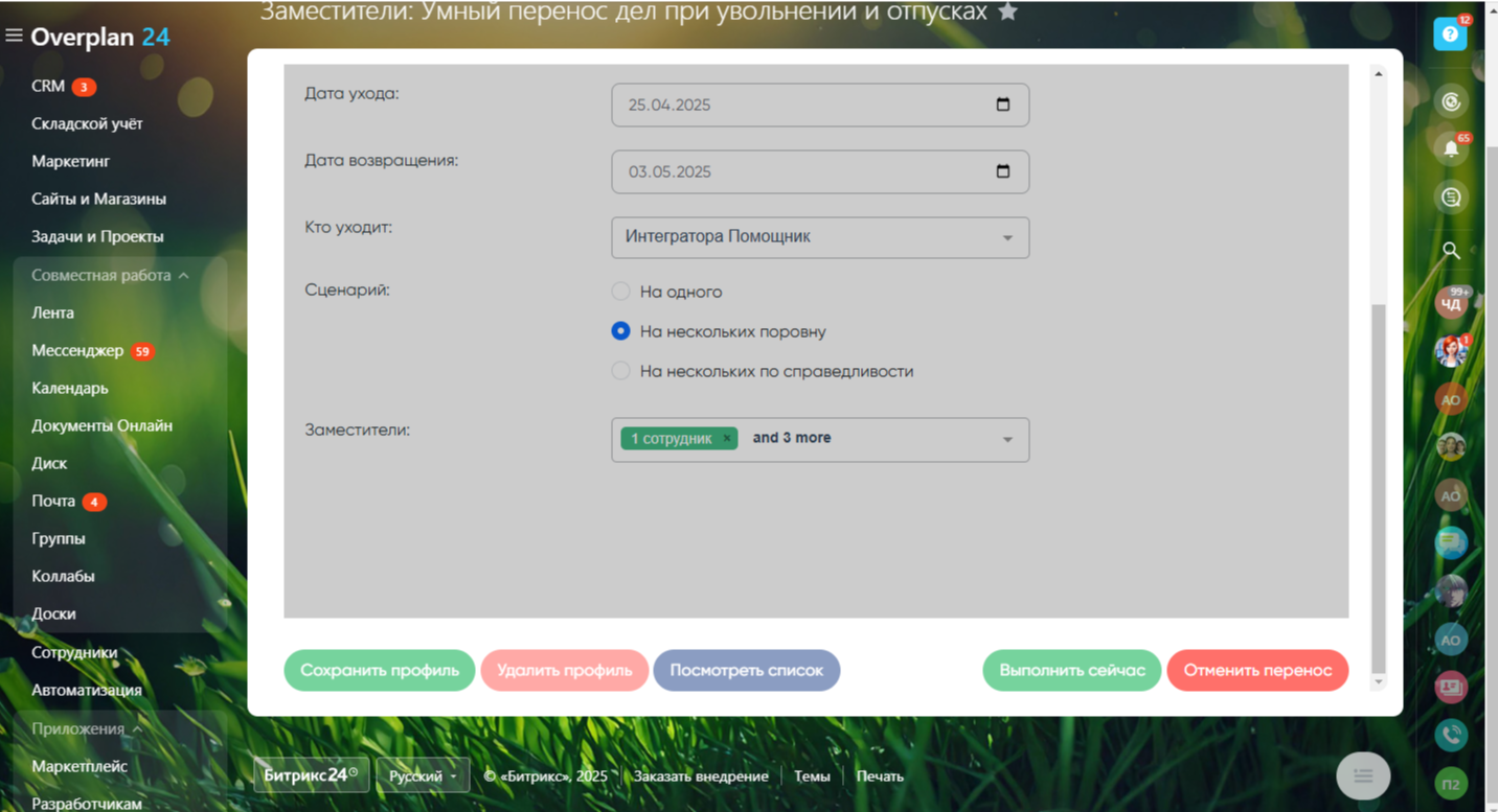 ii. На нескольких поровну - первоначальные сущности (начиная с Лида, далее Сделки и тд) делятся на количество пользователей, выбранных в поле “Заместители”