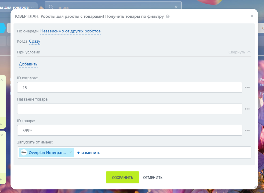 2. Перейдем к настройке и начнём с робота “Получить товары по фильтру”.
