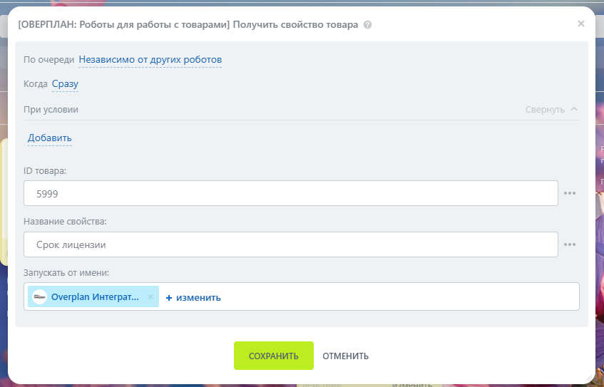 Здесь достаточно указать ID желаемого товара, принимается значение только одного товара (для перебора рекомендуем использовать итератор в БП).