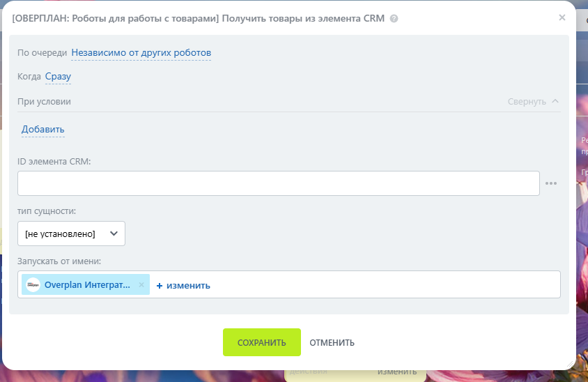 “ID элемента CRM” - указываем ID сущности, в которую необходимо добавить товар.
